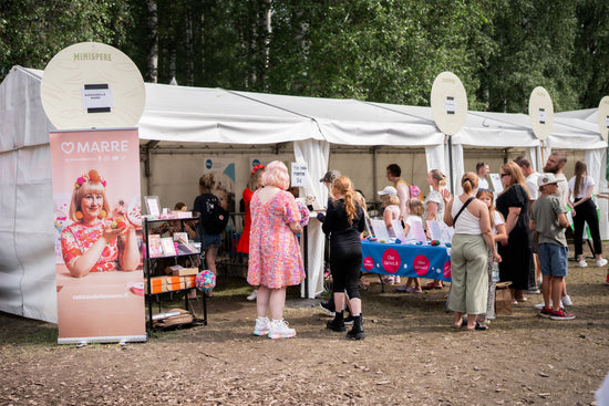 Marre on ollut osa lastenfestari Minisperen alueohjelmaa jo neljänä kesänä! Marren teltalla pääsee askartelemaan pompomeja, ottamaan yhteiskuvia ja myynnissä on ollut myös merchiä ja kirjoja.